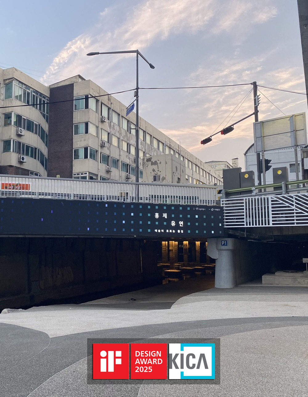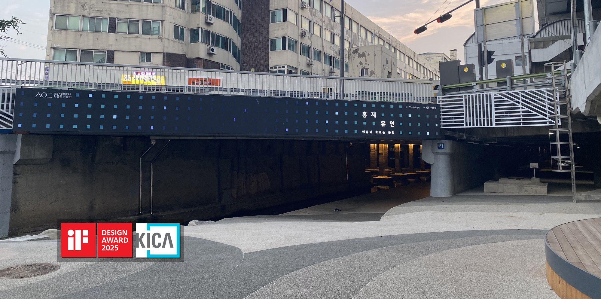 In 2019, various literature surveys and field surveys were conducted in Yujinsangga, the backdrop of Hongje Yuyun. Yujinsangga is located in the center of the Hongje living area in Seodaemun-gu, which has excellent ecological resources. The surrounding area is an aging neighborhood, and before the creation of the open Hongje Cheon-gil, the lower part of Yujin Shopping Street was cut off from pedestrians, with only about 100 local residents using the street per day. Yujinsangga, which has been maintained for 50 years without repair, suffering from a series of failed redevelopments and partial demolitions, was the first major shopping complex in Korea and was a representative landmark of Seodaemun-gu in the 1970s, but today it is recognized as an eyesore. When the Hongjecheon Promenade was built in 2019, an impressive landscape of more than 100 colonnades supporting Yujin Sangga across the Hongjecheon River was discovered in the space beneath the artificial ground. The space was created on the opposite side of the promenade, which had been inaccessible to people, and a bridge was built to connect the paths.